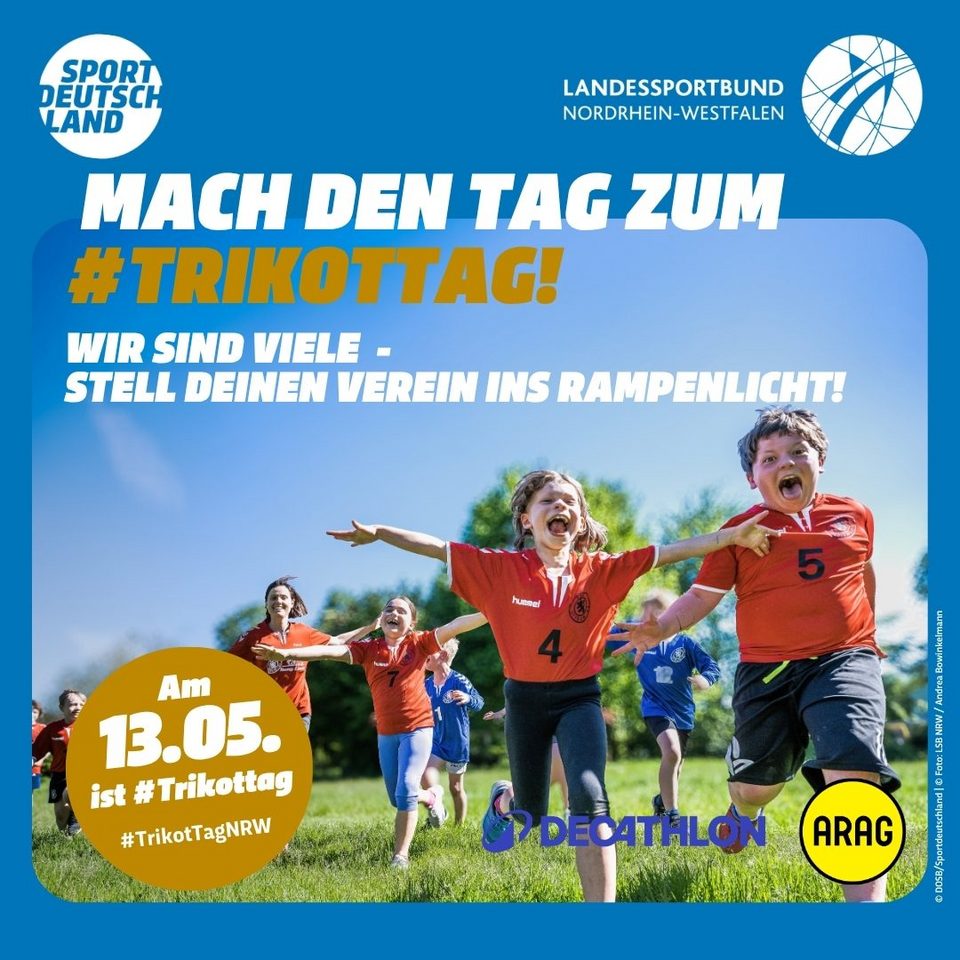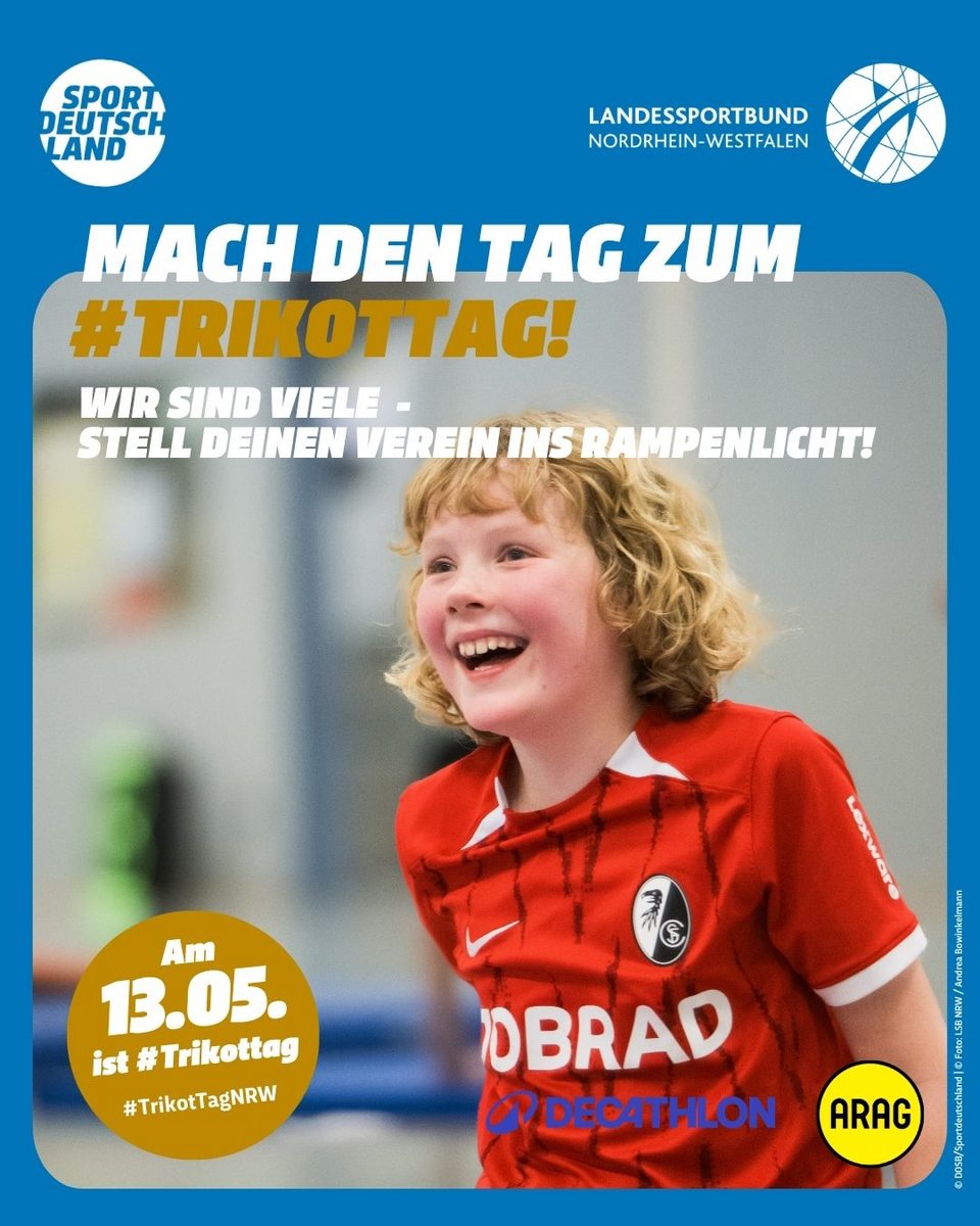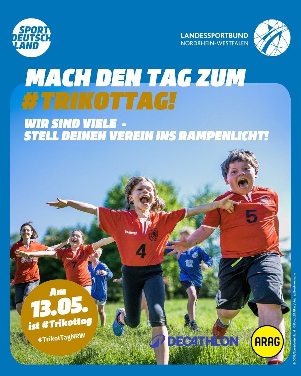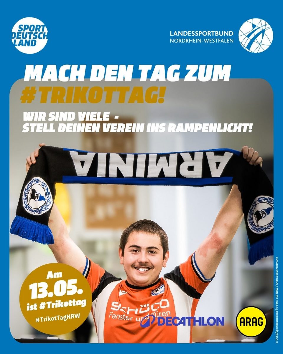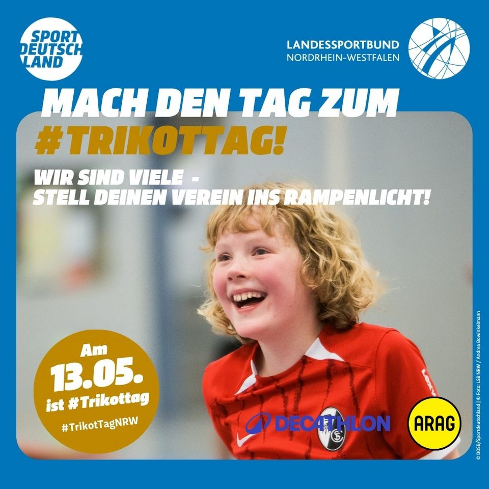 Die Motive zum #TrikotTagNRW stehen hier den LSB-Mitgliedsorganisationen sowie NRW-Sportvereinen als hochauflösende PDF für den Druck, als Kachelformat für Websites sowie als Social Media-Grafik zum freien Download zur Verfügung. Bedient Euch und werbt gemeinsam mit uns für den TrikotTag in NRW und motiviert Eure Mitglieder, einen Tag im Trikot stolz den Verein zu präsentieren.