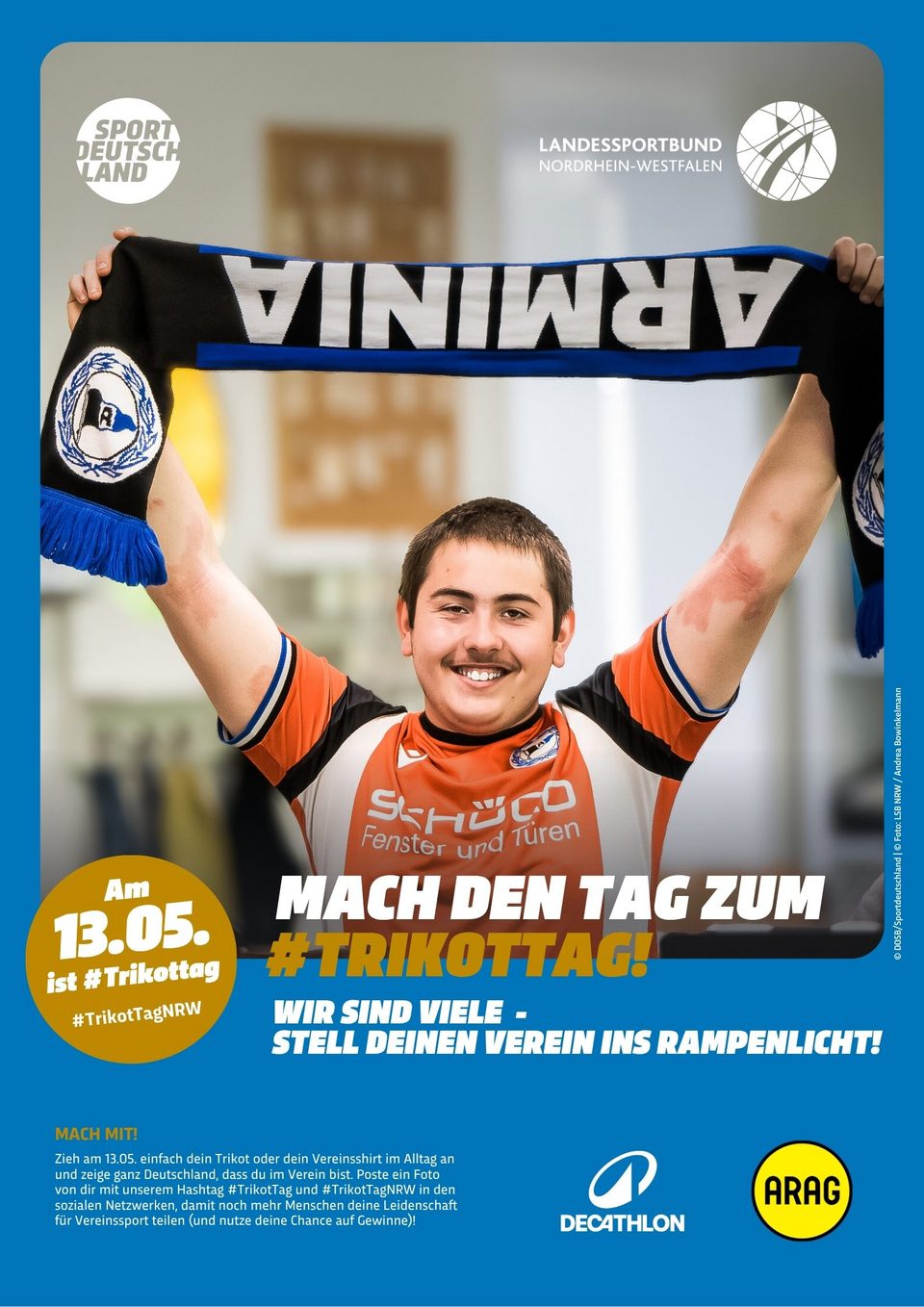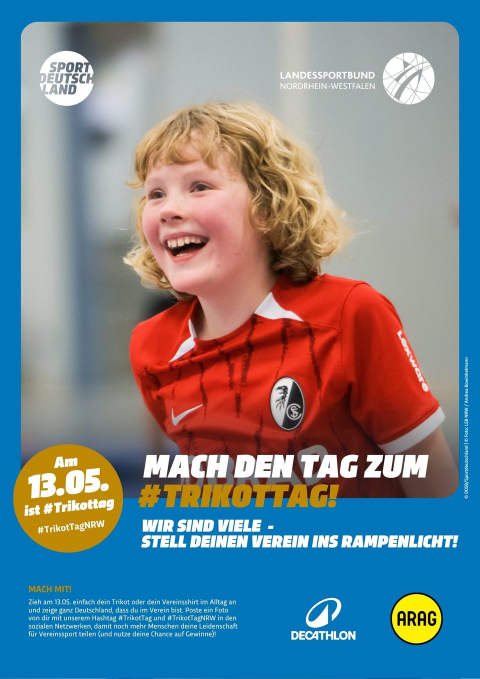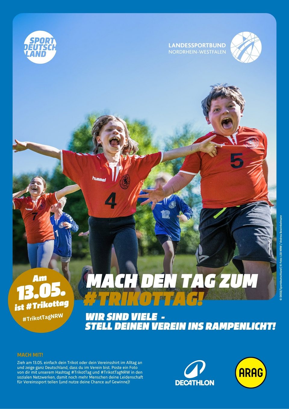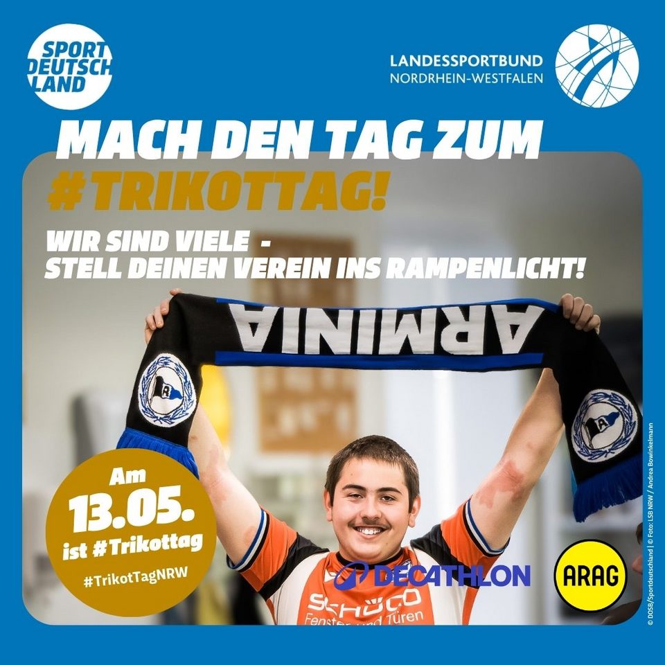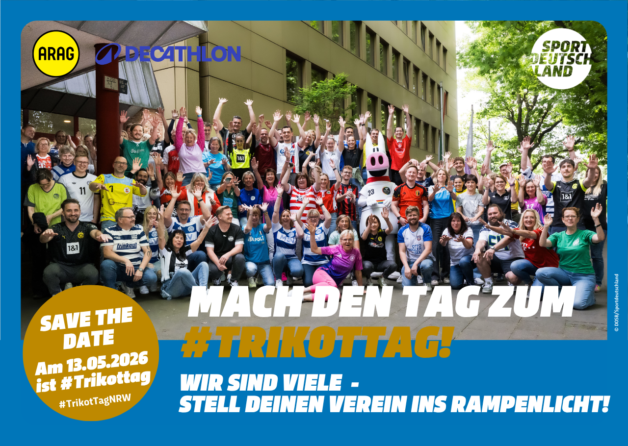 Die Motive zum #TrikotTagNRW stehen hier den LSB-Mitgliedsorganisationen sowie NRW-Sportvereinen als hochauflösende PDF für den Druck, als Kachelformat für Websites sowie als Social Media-Grafik zum freien Download zur Verfügung. Bedient Euch und werbt gemeinsam mit uns für den TrikotTag in NRW und motiviert Eure Mitglieder, einen Tag im Trikot stolz den Verein zu präsentieren.